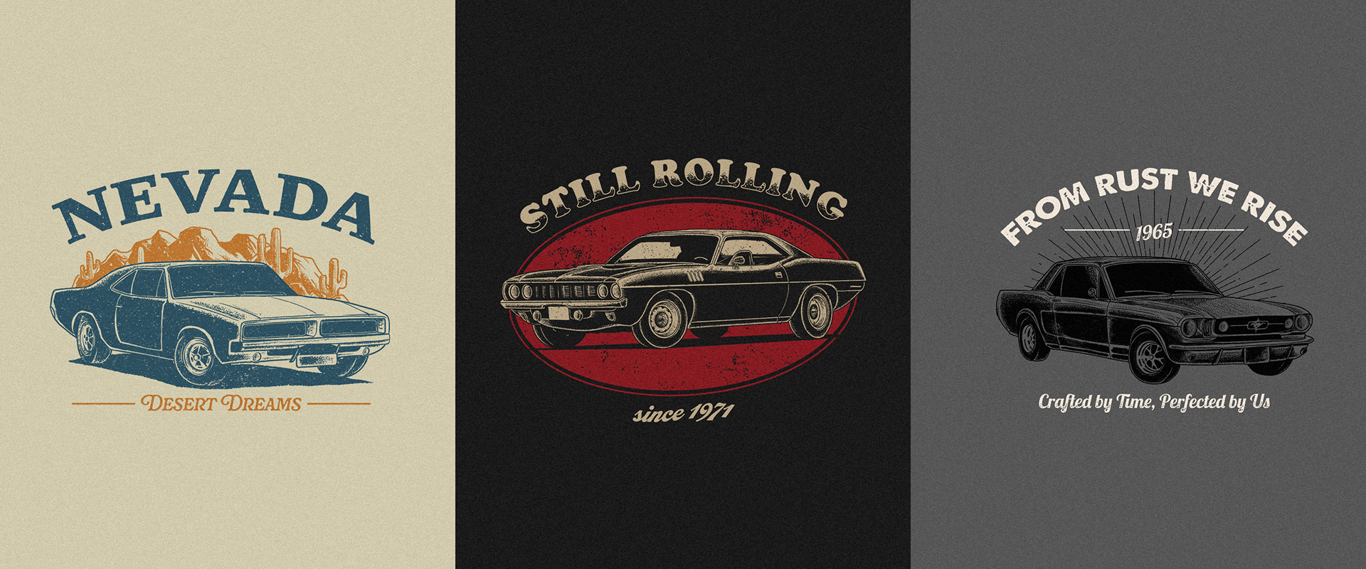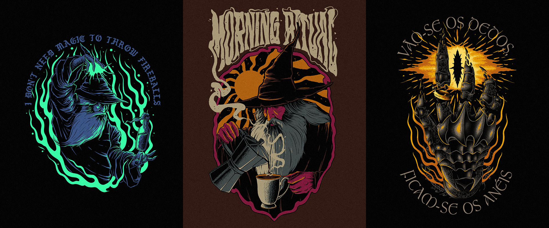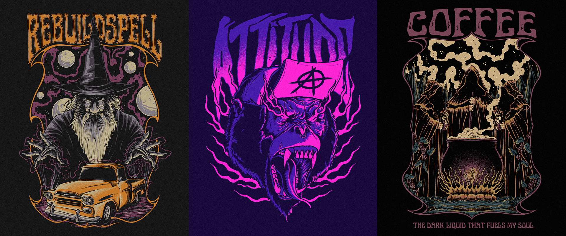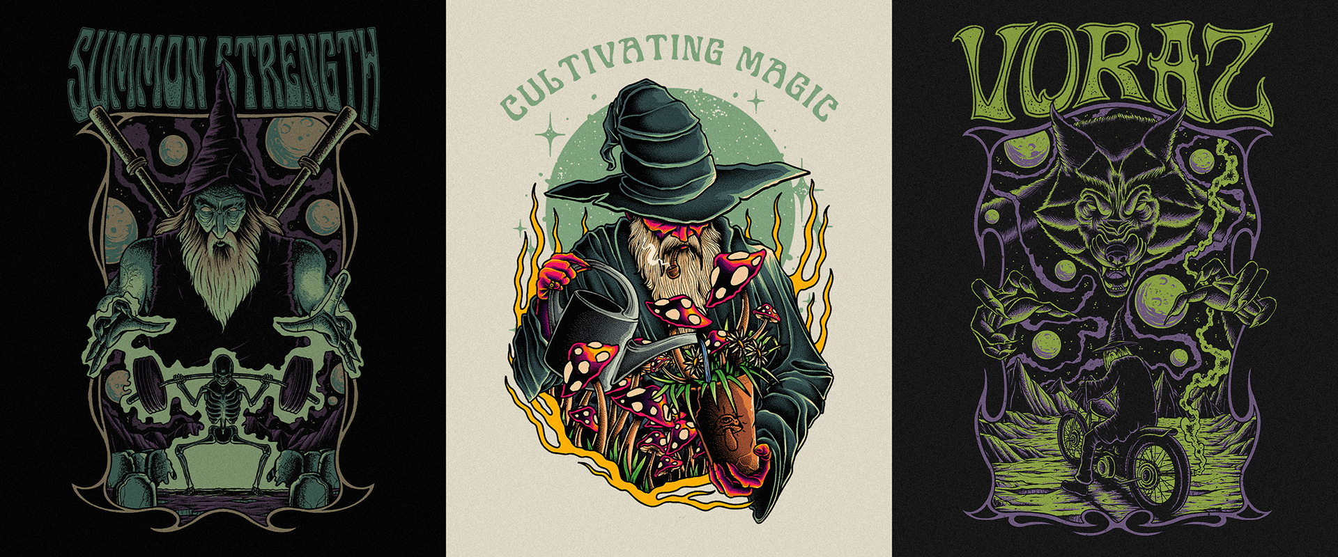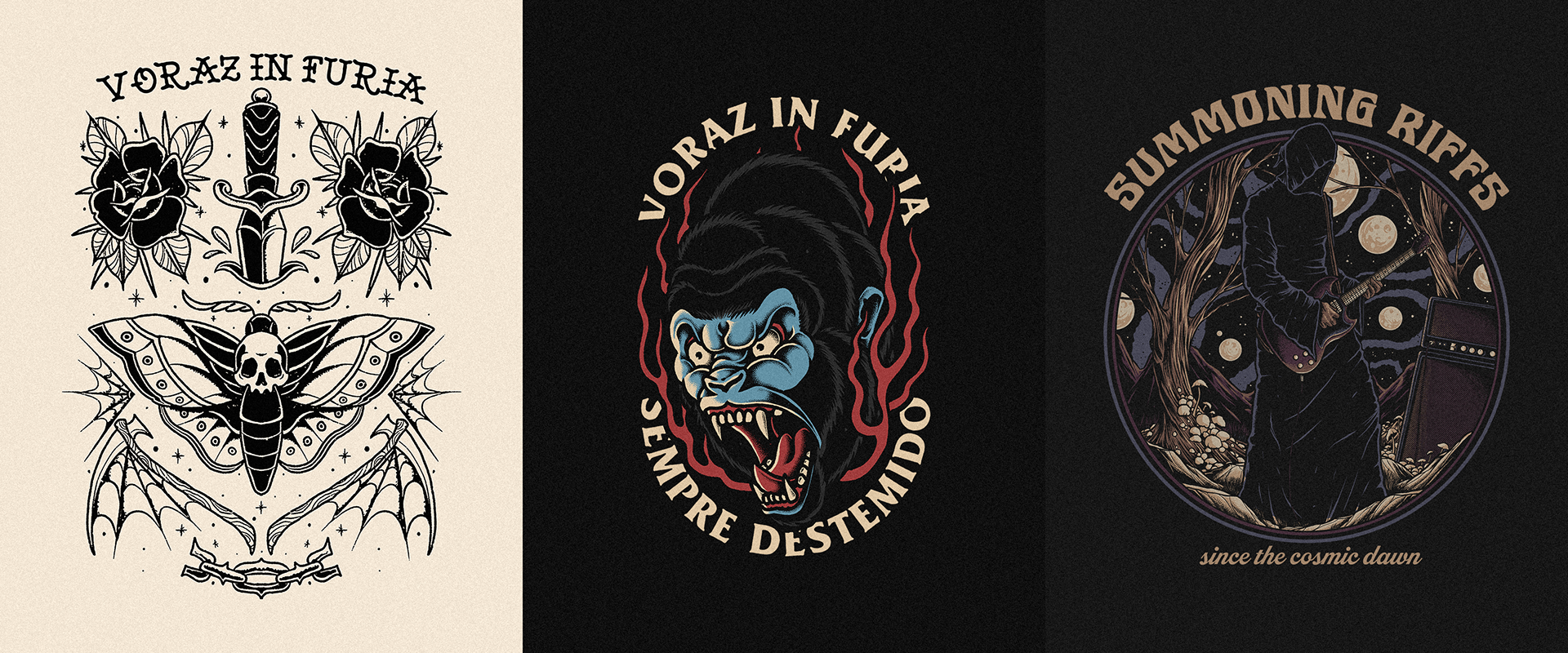 Illustrations created in 2024 for t-shirts and apparel, including commissioned works and personal projects.